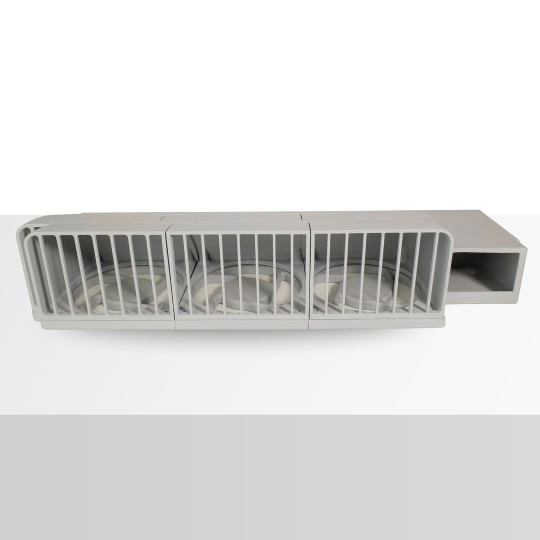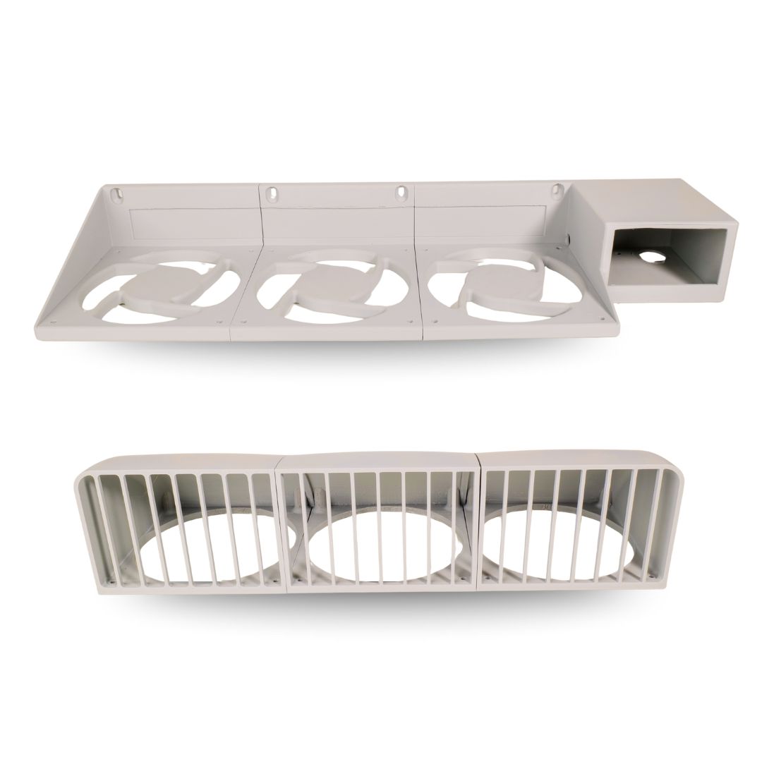 Structura este printată din PETG pentru rezistență mecanică și stabilitate la temperaturi ridicate, potrivit pentru exterior protejat sau spații tehnice ventilate. Setul include corpul principal cu trei ferestre de 120 mm, grilaj frontal de protecție detașabil și compartiment lateral pentru controller PWM/termostat de 12 V, cu trecere cabluri. Se recomandă montaj cu dibluri/șuruburi în perete/placă și alimentare 12 V separată pentru ventilatoare și controller.